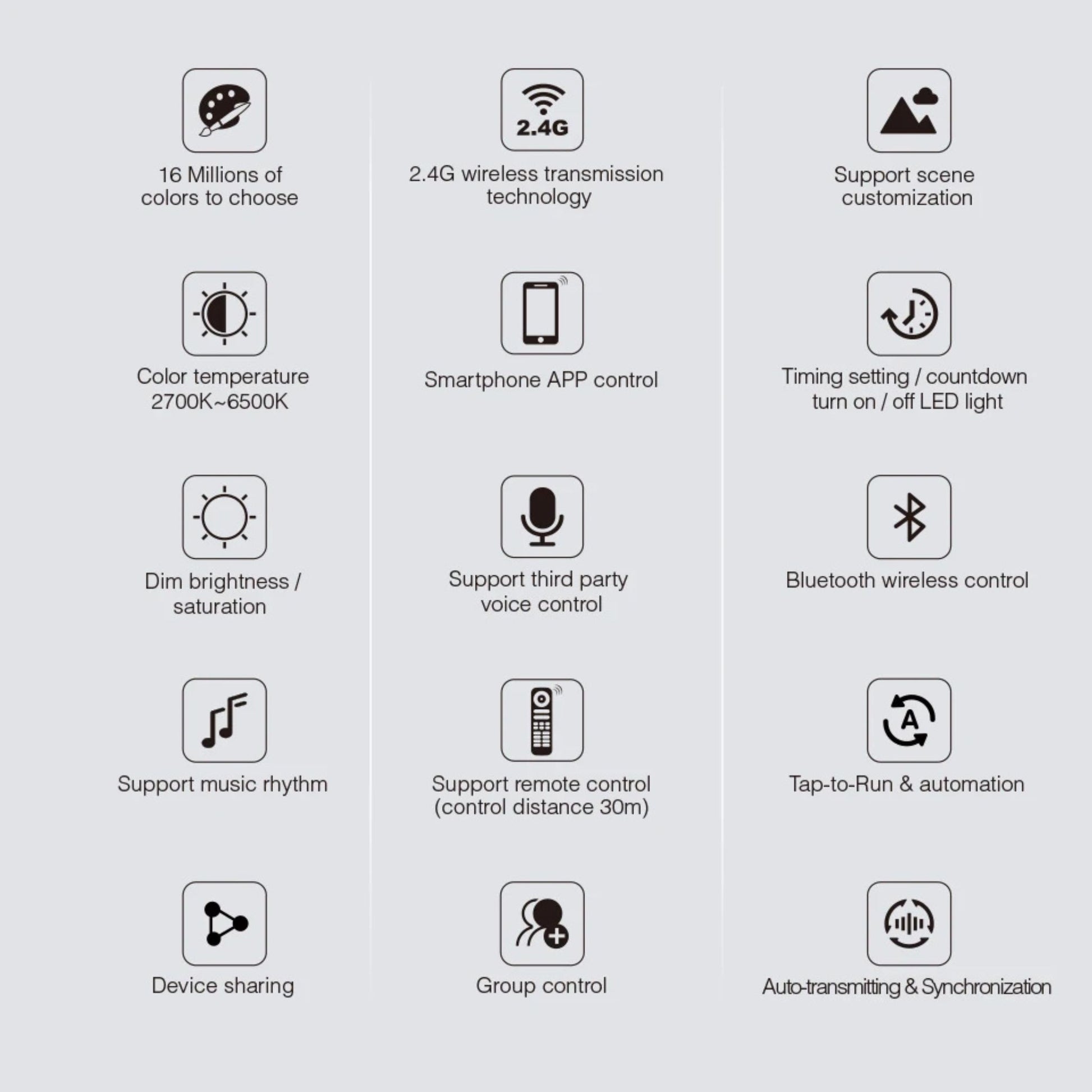 - Create the perfect lighting atmosphere: 16 million color options with adjustable brightness and saturation